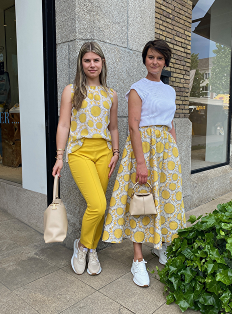Detail: ronde hals met kleine plooitjes - splitjes zijkant van 12 cm - blinde ritssluiting 23 cm - zonnebloem print.