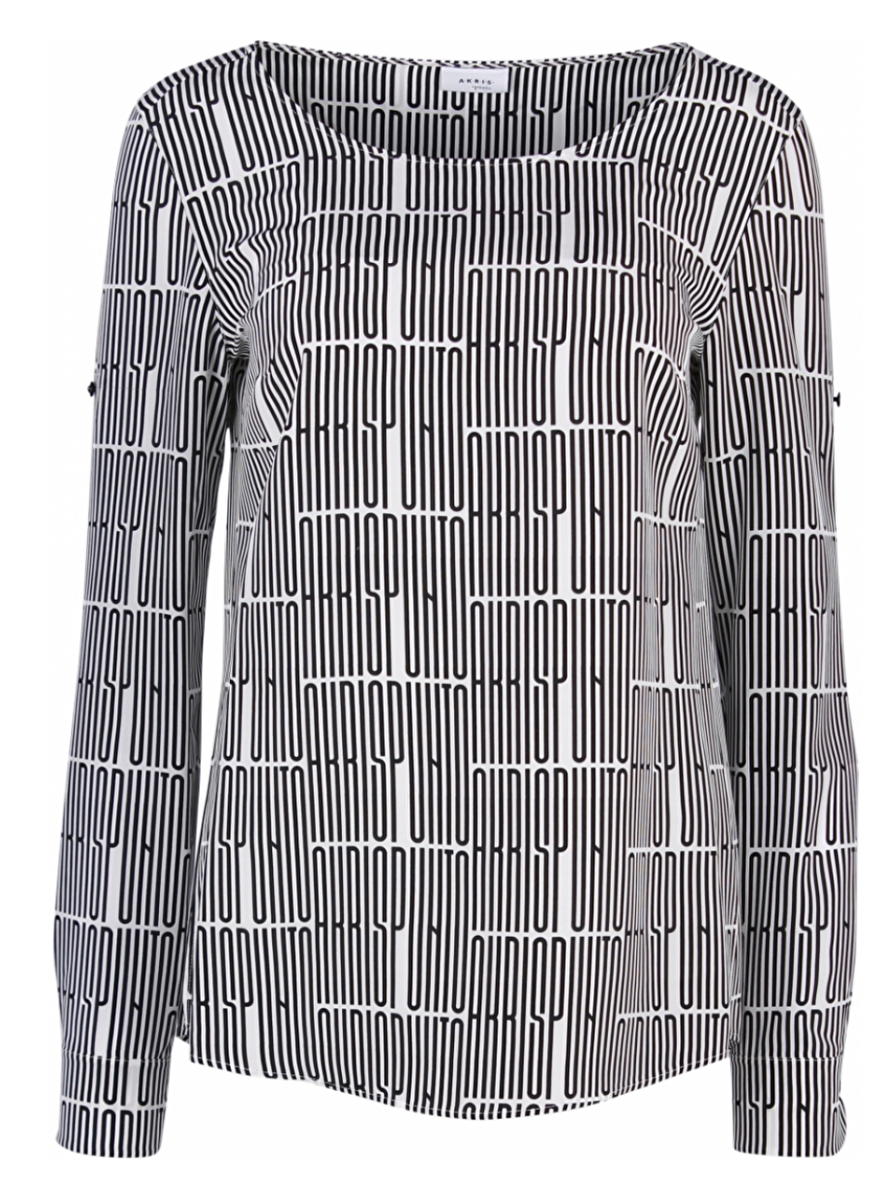 Fijne blouse zwart off white met print van Akris Punto. De halslijn is rond. De onderkant van de blouse is mooi rond afgewerkt met splitjes van 12cm. De print is ook bijzonder als je goed leest ... aha, Akris Punto!