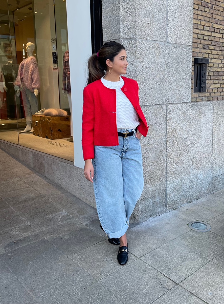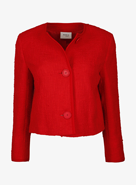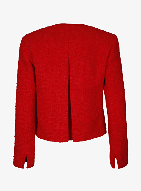 Detail: ronde hals - 3 knoop sluiting - hals en sluiting zijn afgebiesd - steekzakken - gevoerd - stolpplooi aan de achterkant.