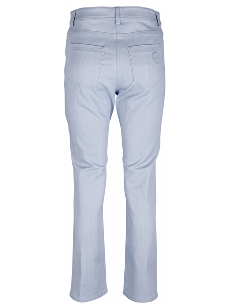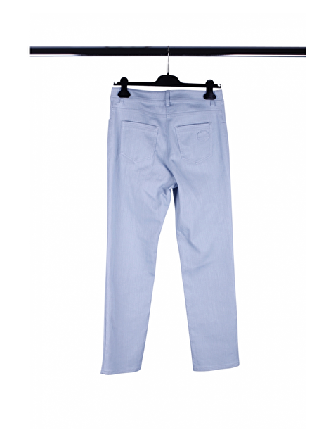 Jeans five pocket met rond cirkeltje op de achterkant zak. Gladde zilverkleurige knoop. Highwaist.