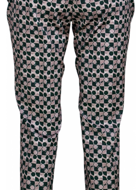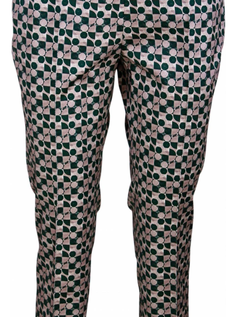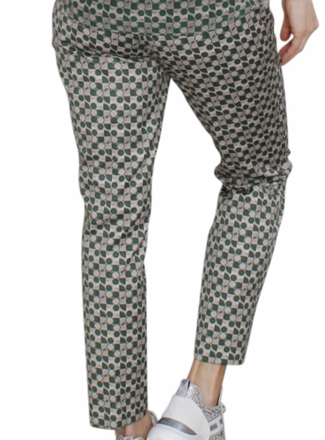 Pantalon in beige groen met cirkels. Deze heeft twee rechte zakken en een ritssluiting aan de linker zij.