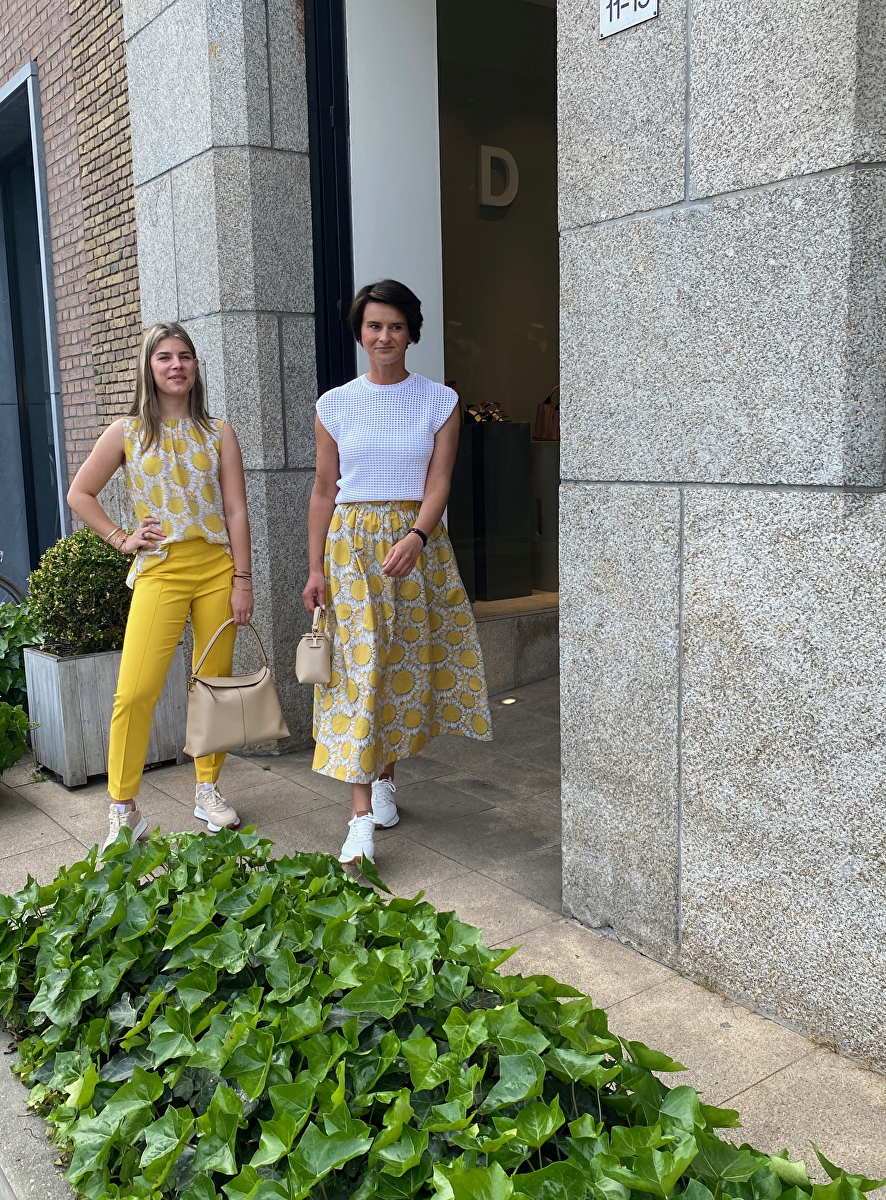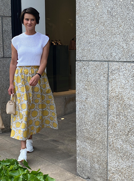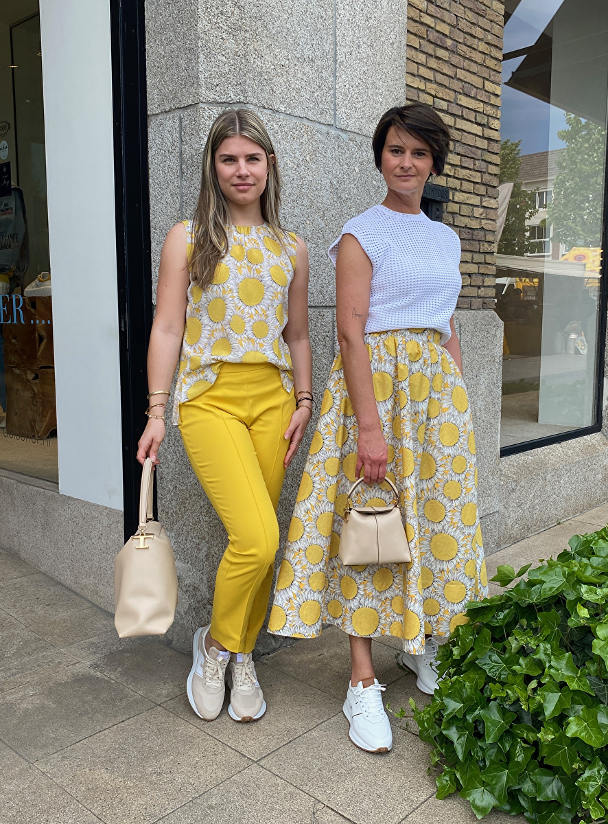 • Detail: achterkant elastische tailleband - zonnebloem dessin - blinde ritssluiting met lus en knoopje achterkant 20 cm - kleine plooien.