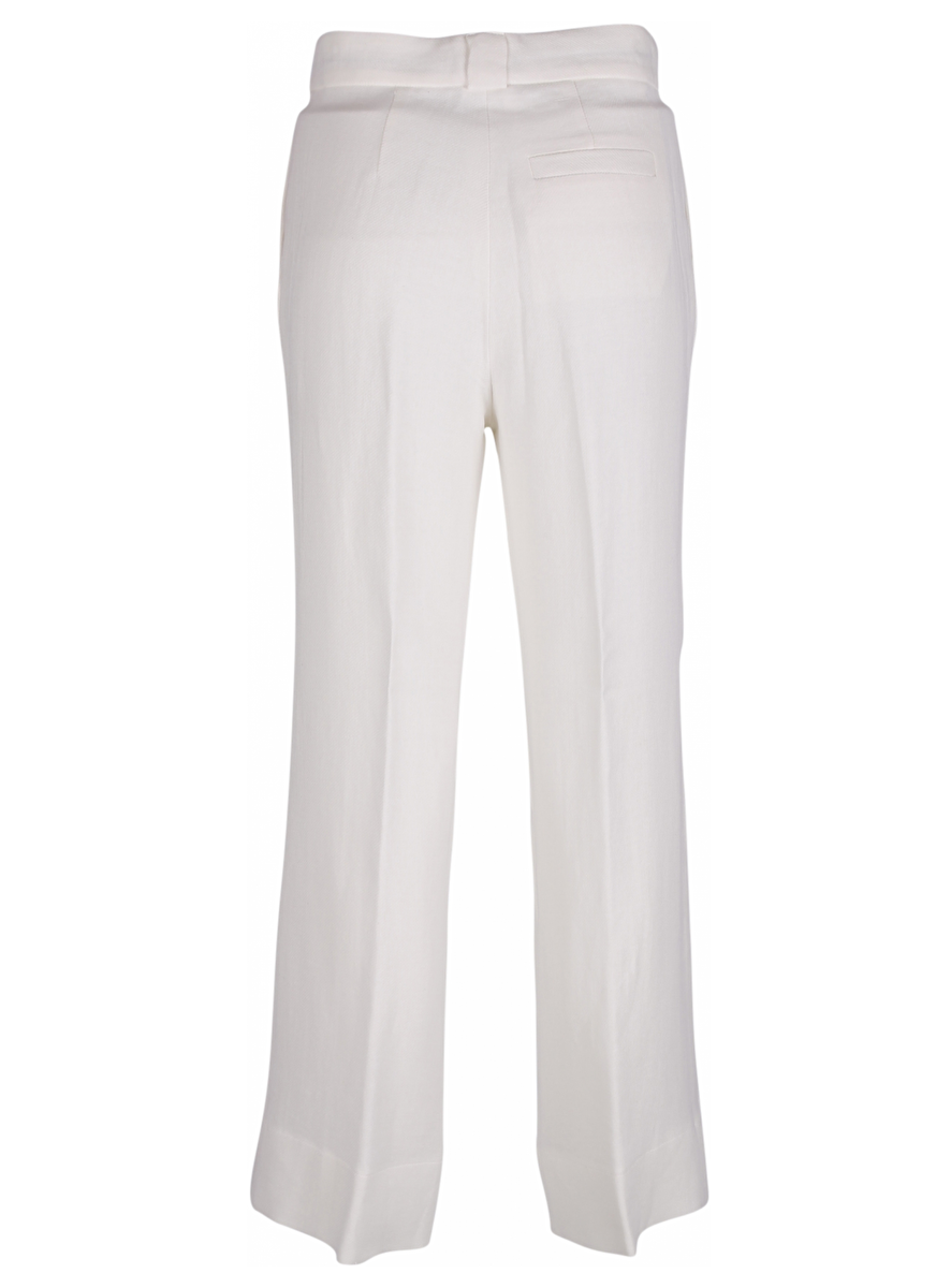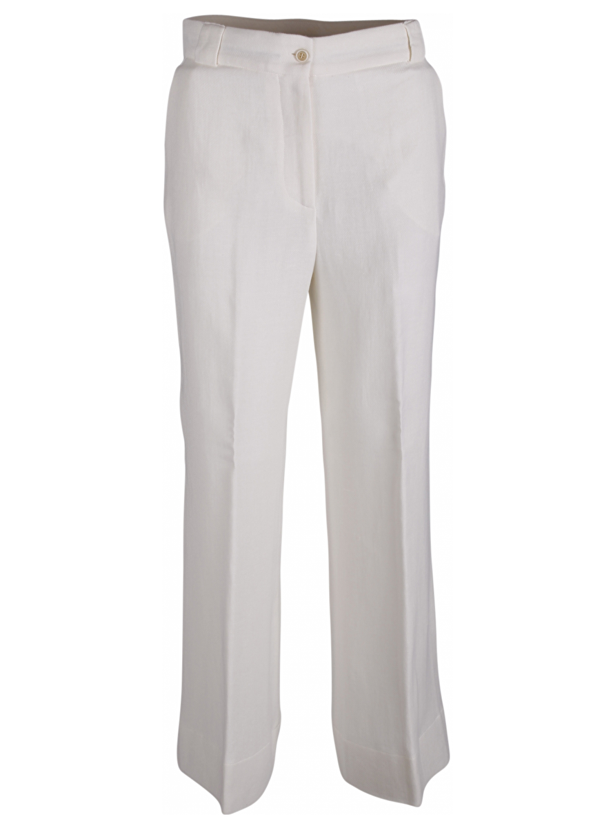 Broek met structuur in offwhite. Steekzakken. Blinde paspelzak. Ceintuur lussen. Broekspijpen zijn recht en breed.