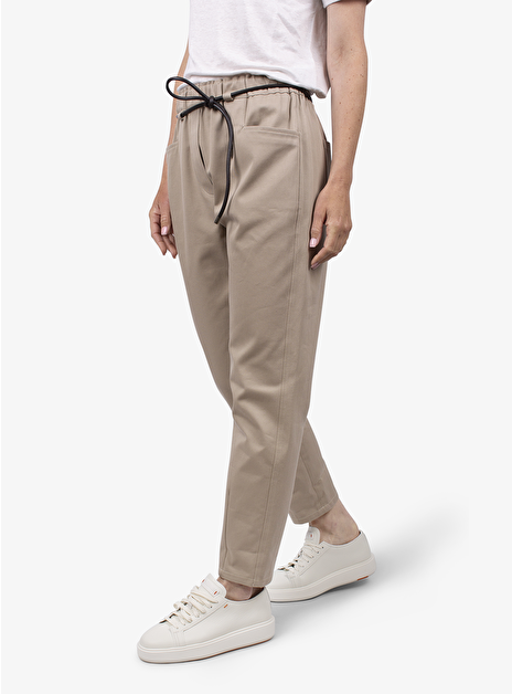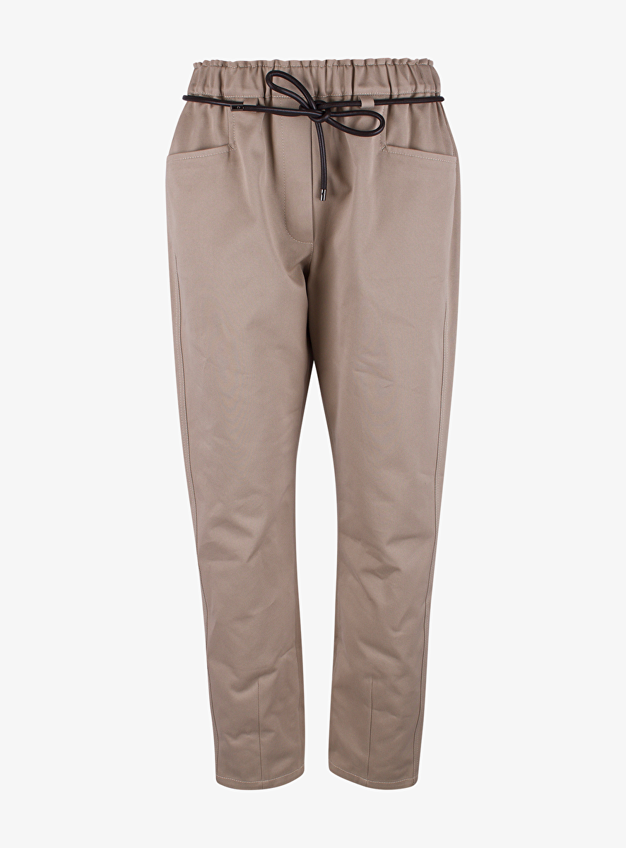 Detail: broek met een dun leder veter ceintuurtje en smoked zilver stiften aan de uiteinden - diepe zakken aan de voorkant en achterkant - elastische taille - aan de onderkant van de broekspijp zit een figuurnaad (voor en achterkant) waardoor de pijp taps toe loopt.