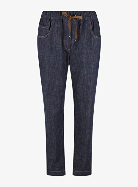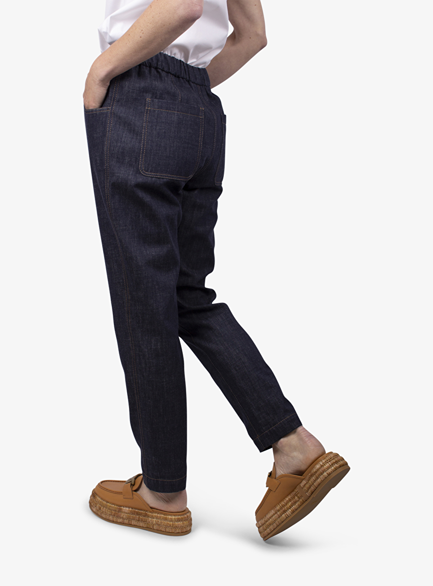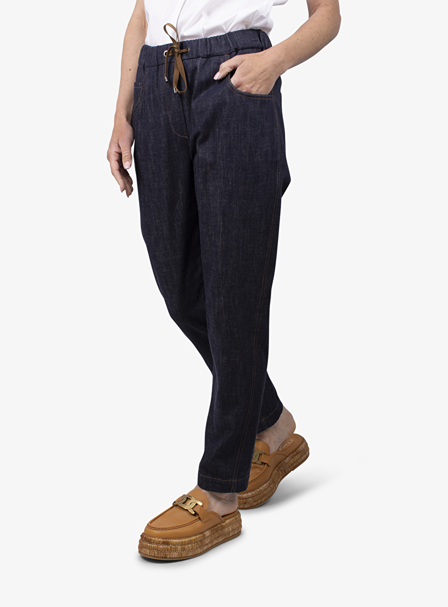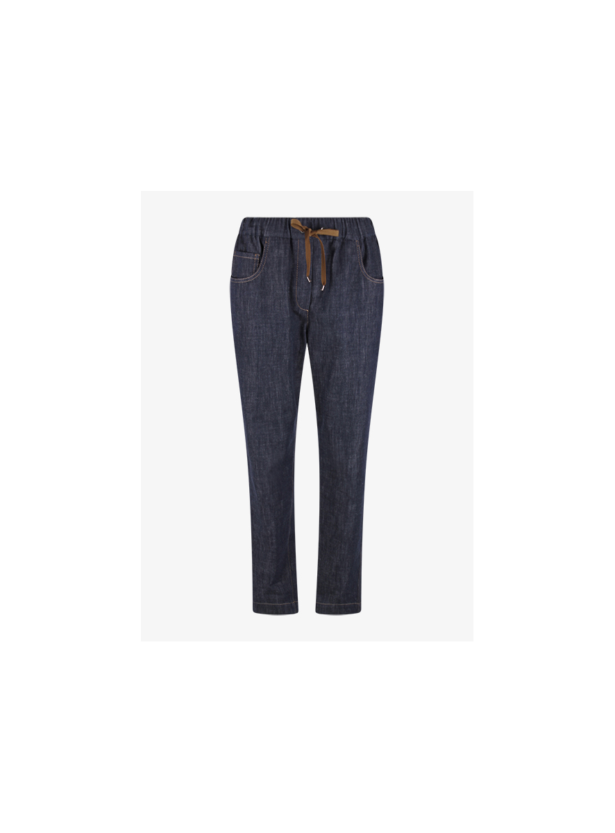 Detail: elastische taille - strikveter - 5 pocket - tapered broekspijpen.