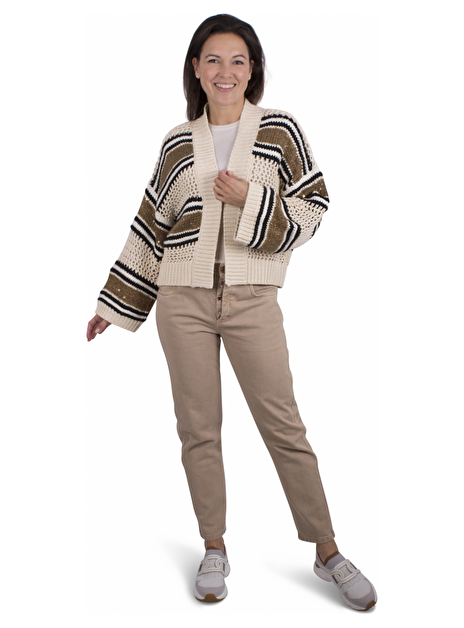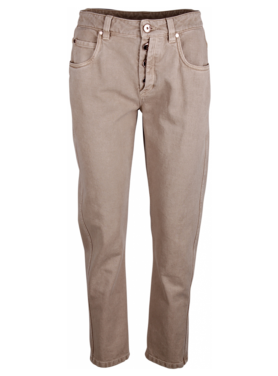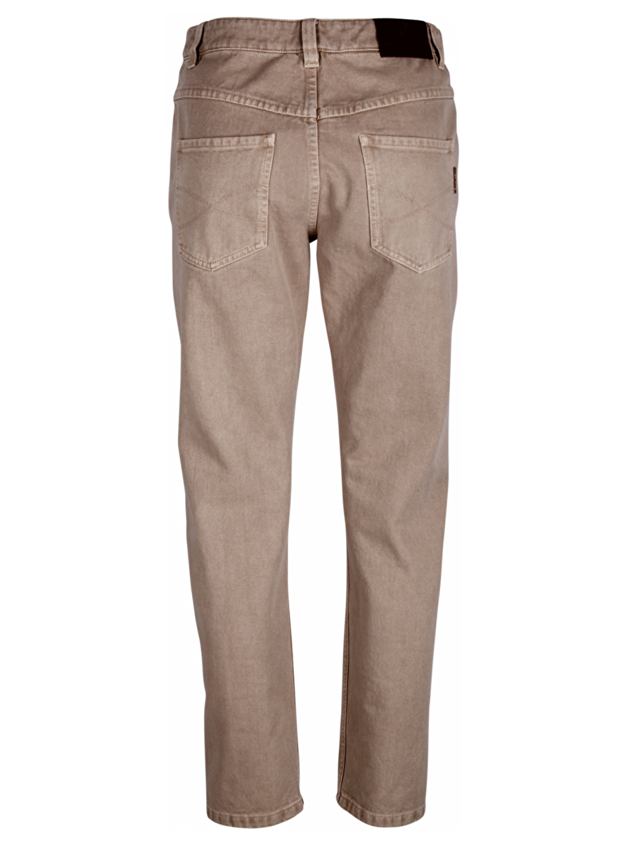 Mom jeans five pocket beige. Gulp knoopsluiting. Koperen knoop en popnagels. Donkerbruine leder patch achterkant taille.