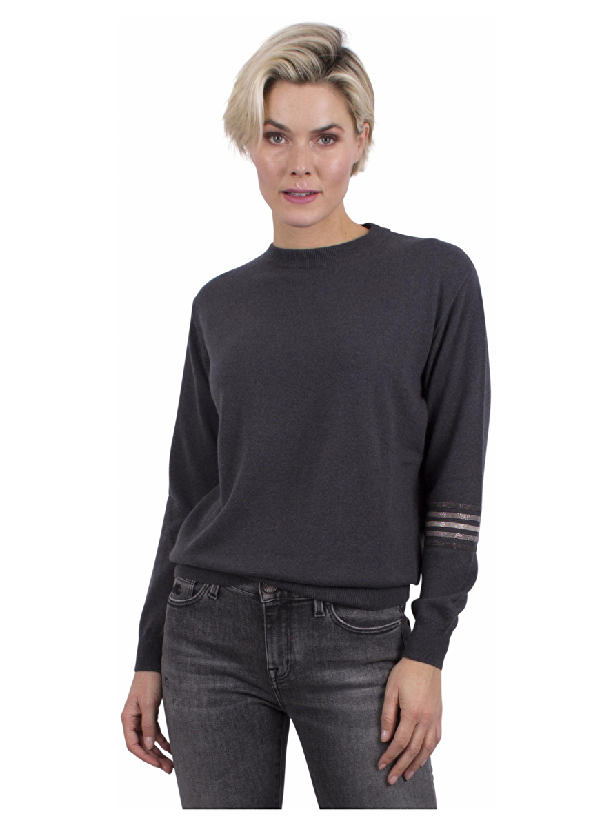 Grijze cashmere pull met ronde hals. Oversized. Smoked en zilver glitter kraaltjes stripes op de linkermouw.