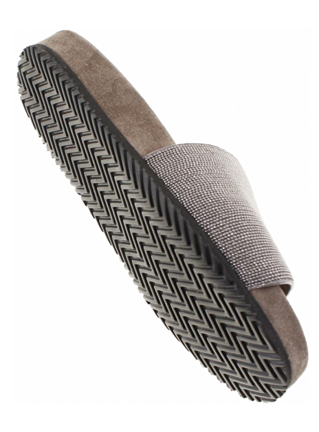 Sandalette met fijne zilver glitterkraaltjes. Deze heeft een suede, relaxt voetbed met een zwarte zool.