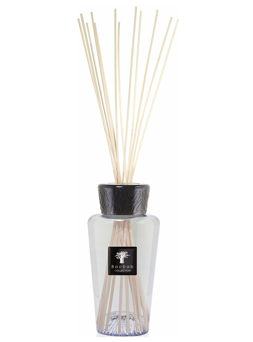 De White Rhino geurverspreider voor binnenshuis is van erg elegant iriserend grijs glas. De subtiel afgeronde fles is afgedekt met een zwarte bakelieten stop gegraveerd met een wortelmotief, waardoor het sierstuk een erg decoratief karakter krijgt.