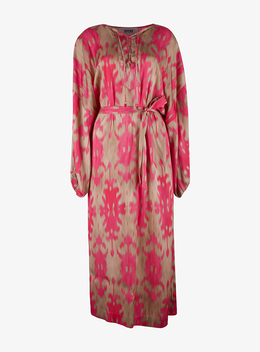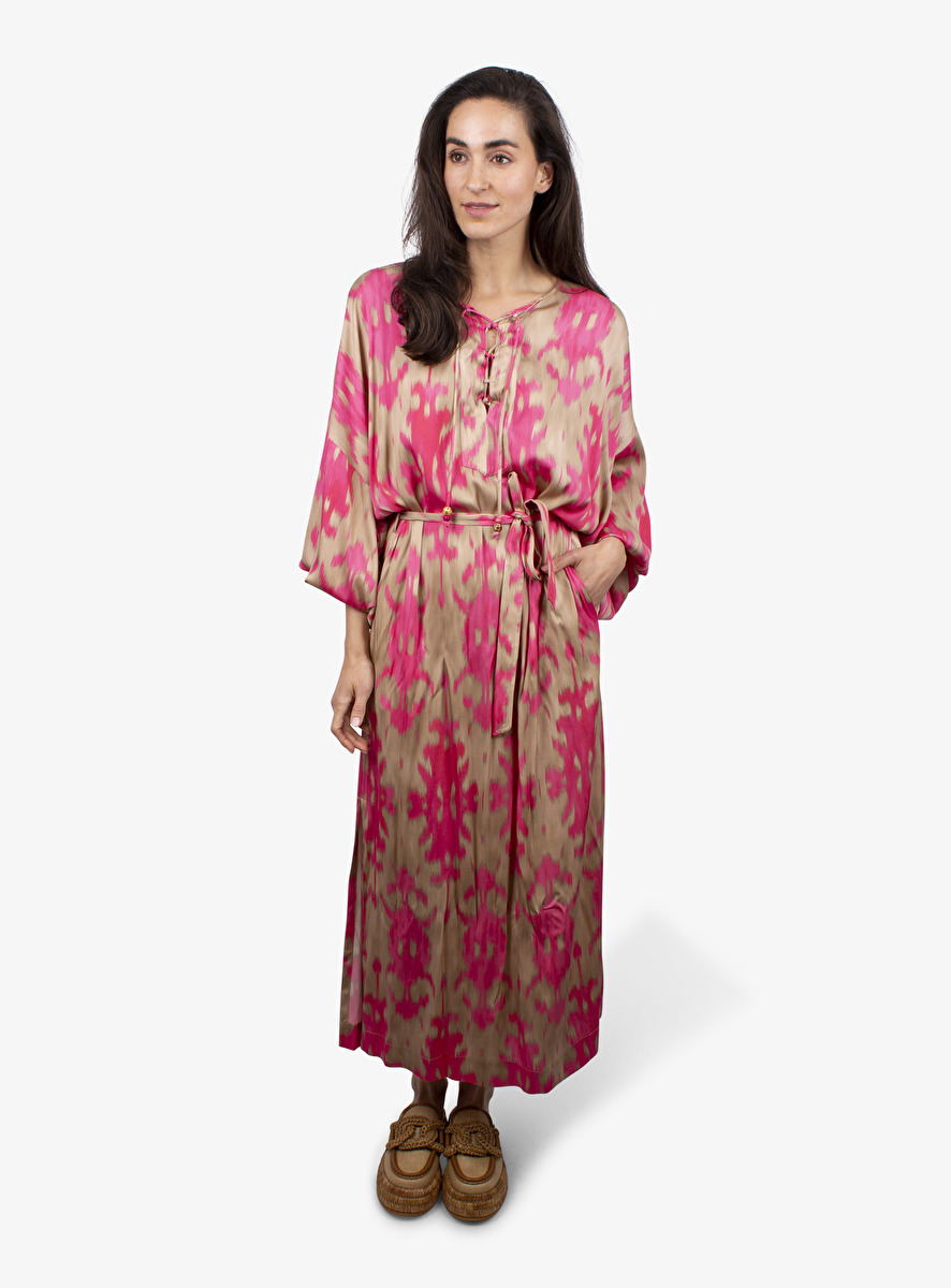 - Detail: midi jurk met nude, pink dessin allover en een decolleté met rijgkoord en kralen - een stoffen ceintuur - lange splitten - zakken in de zijnaad.