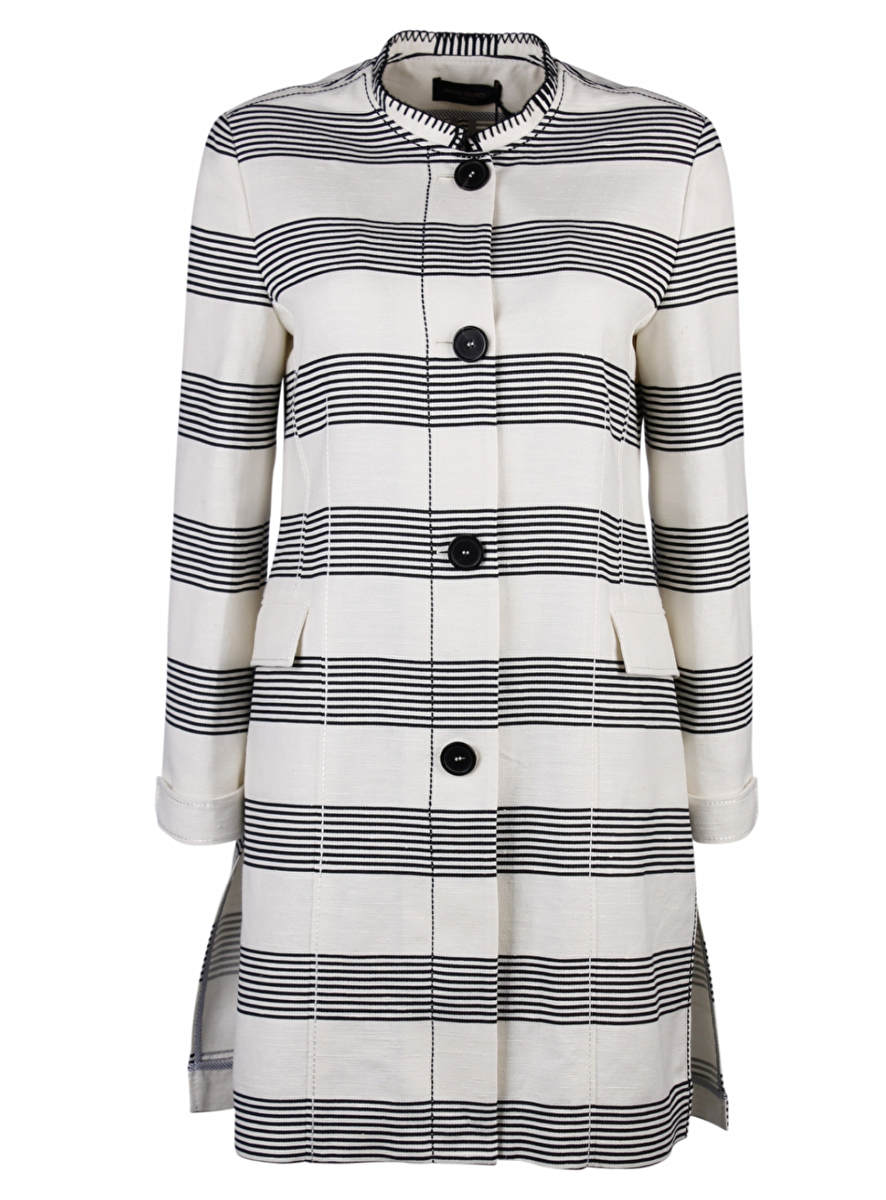 Deze Off-White lange jas is navy gestreept met feston steken. De kraag is rond en de sluiting heeft vier grote knopen. De zijkanten van de jas hebben twee splitten van 28 cm. De voorkant van de jas heeft twee steekzakken met klepjes en de mouwen hebben een extra manchet.