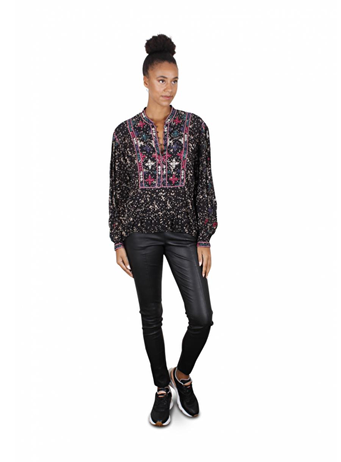 Blouse tuniek zwart beige dessin. Deze is afgewerkt met borduur in groen, blauw, framboos op hals, voorkant en manchetten. Aantrek koord onderkant zoom.