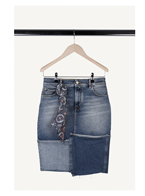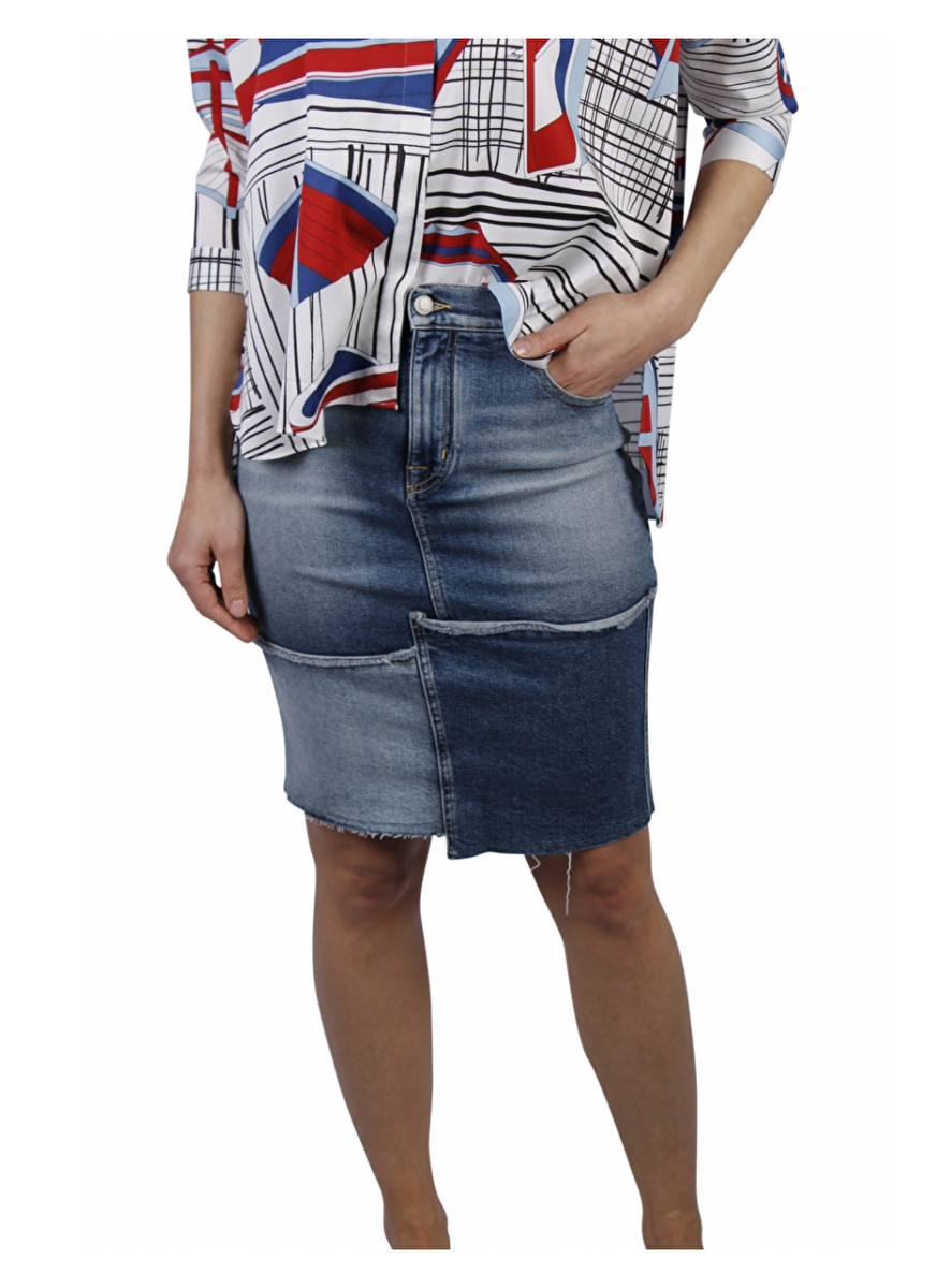 Deze rok van jeans heeft patchwork vlakken in lichte en donkere jeans kleuren, wat een super leuk effect geeft. Echt een mooi jeans item. De rok is helemaal hip van lengte op de knie. Een aanrader voor de zomer!