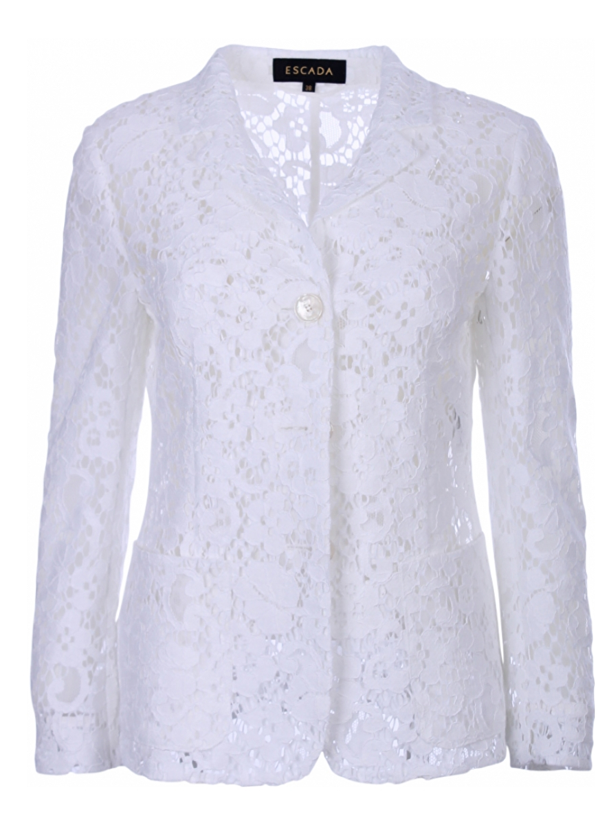 Blazer van kant uitgevoerd in het wit. Deze waanzinnig mooie blazer heeft een aansluitende pasvorm en is geheel transparant. De blazer heeft een lange mouw, revers en kan met 2 knopen worden gesloten. Aan de voorzijde zitten twee zakjes. Het materiaal bestaat uit 44% katoen, 36% viscose en 20% polyamide.
