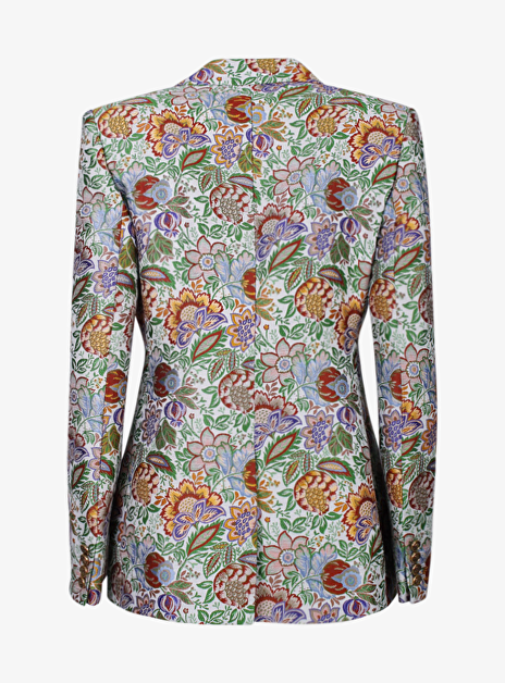Detail: bloemen borduur allover - rever - 2 knoopsluiting logo - grote afgeronde zakken - gevoerd - manchetknoopjes logo.