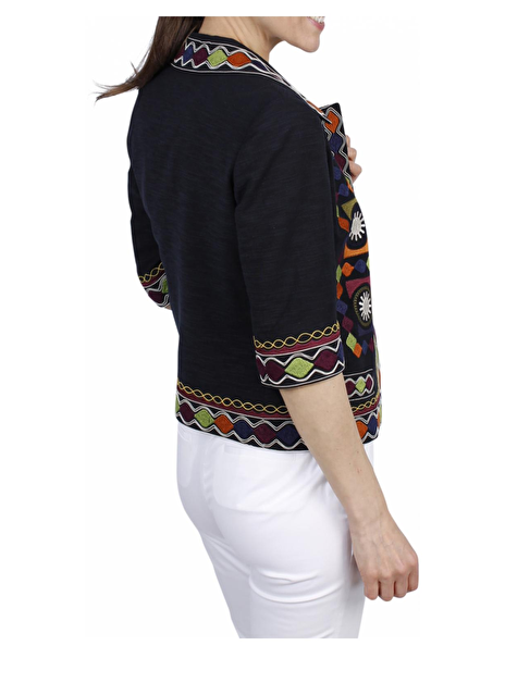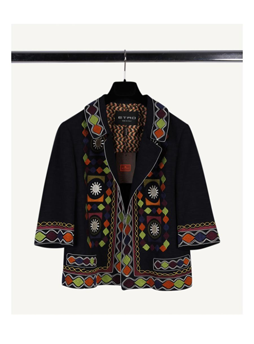 Marine blazer met diverse kleuren zoals: terracotta, blauw, offwhite, paars en geel. De jas valt kort en heeft een mooi etnisch borduurwerk 'All over'. De mouwen zijn driekwart. Het jasje valt open en is aan de binnenkant helemaal afgewerkt met een paisleyprint. Etro mooi!