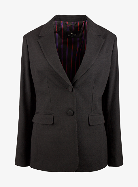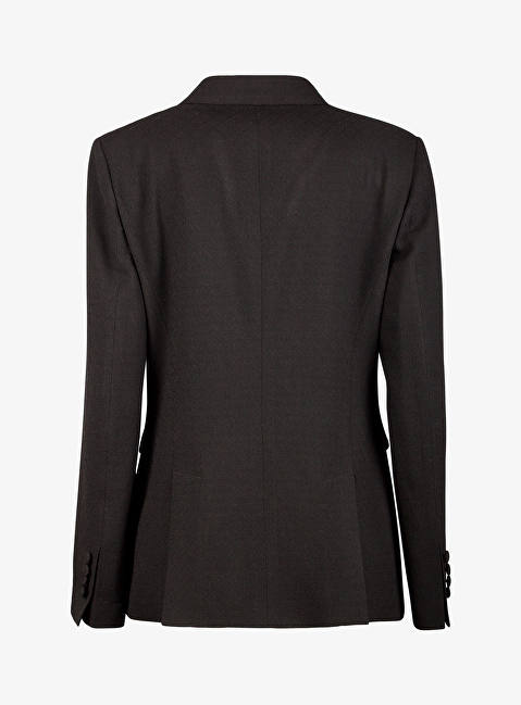 Detail: diep rever - structuur - stoffen knopen - klepzakken - 2 zijsplitjes 20 cm - 4 manchetknoopjes - blind pochet.