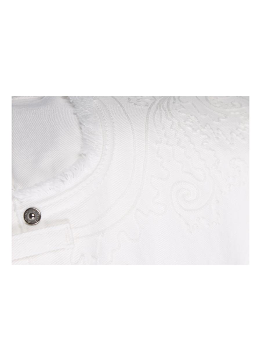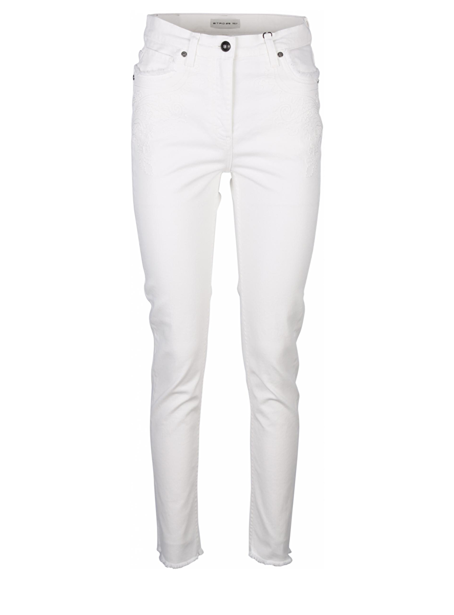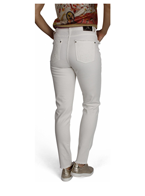 Deze offwhite jeans van Etro heeft aan de voor en de achterkant ton sur ton borduursels. Aan de bovenkant van de zakken fijne franje randen deze zitten ook aan de onderkant (de zoom) van de broek. Aan de taille is het logo van Etro verwerkt in een metaalplaatje met leder.