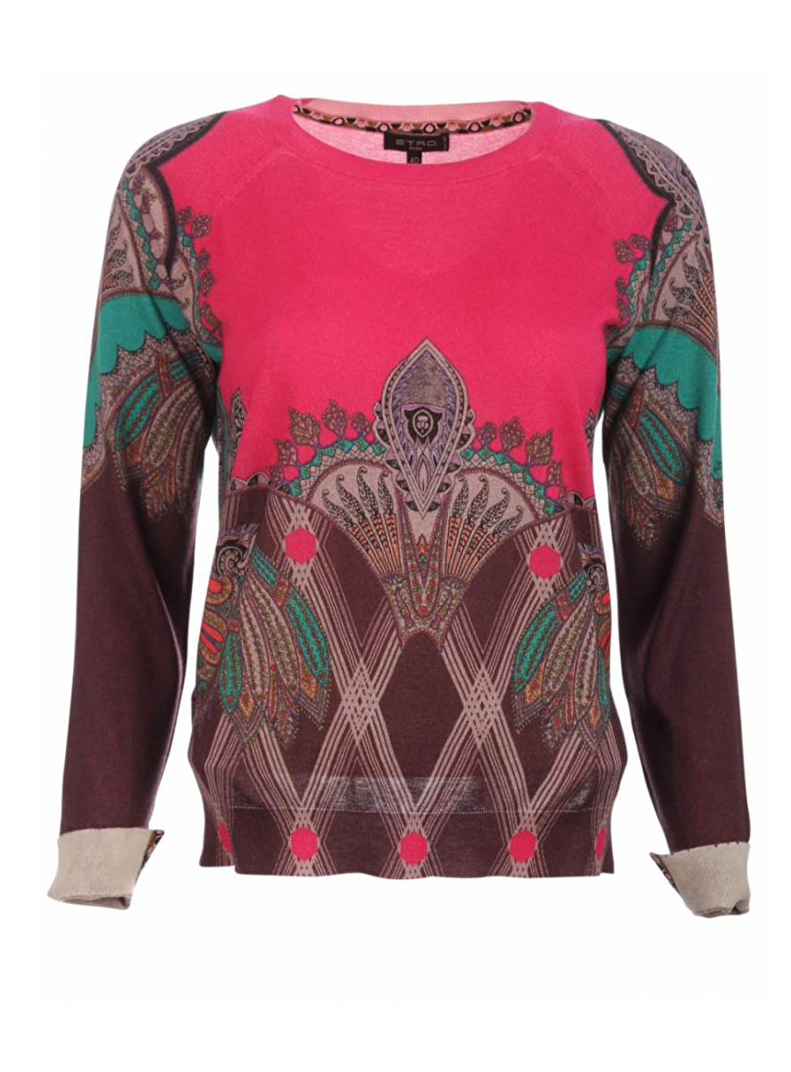 Cyclaamkleurige pull van het Italiaanse merk Etro. De pull heeft een lange mouw, ronde hals en prachtig dessin met oa aubergine, turqoise en paars tinten. Aan de zijkanten twee splitjes. Het materiaal bestaat uit 55% zijde en 45% cashmere.