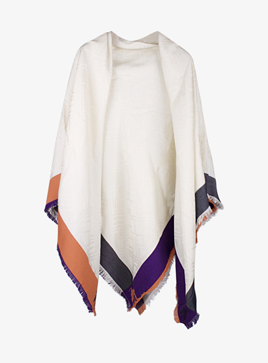Shawl offwhite abstract geweven dessin met paars, oranje en zwarte strook. Etro peagasus logo.