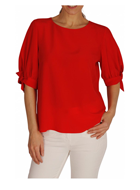 Deze zijde fel rode top heeft een ronde uitgesneden hals. De mouwen zijn afgewerkt met een strik of knoop wat tevens ook zorgt voor een pof model in de mouw. De top is recht slankvallend, wat zorgt voor een soepel en fijn draag comfort.