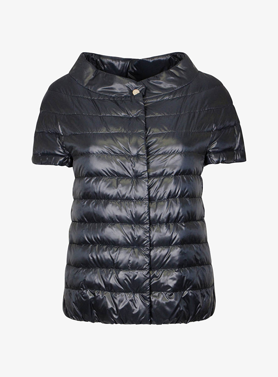• Detail: recht opstaande ronde kraag - blinde sluiting met drukknopen - kapmouwen.