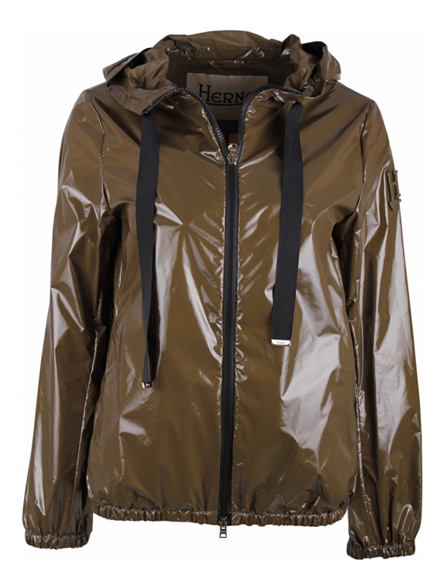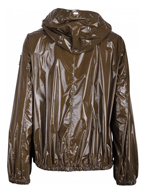 Luchtig dun jack in lak uitvoering met capuchon en grove ritssluiting. Lint koord met metallic platte goudkleurige stiften. Logo op klitteband schouder. Elastische manchetten en zoom. Zakken met ritsluiting.