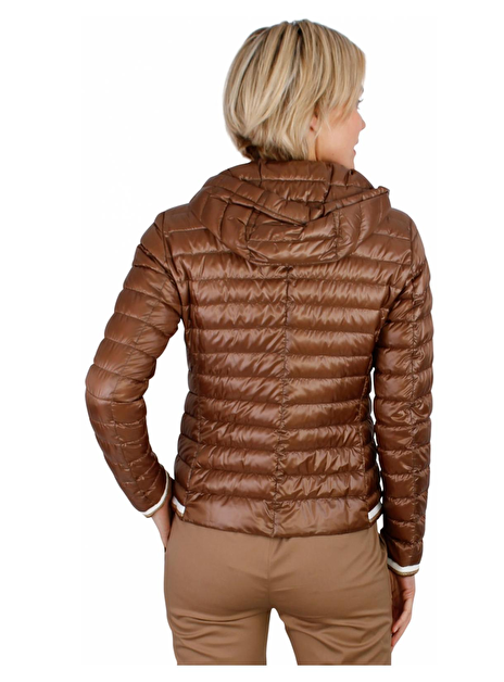 Gestept jack met afneembare capuchon en aantrek koord. Manchet mouw en achterkant zoom van de jas is afgewerkt met een wit en een goudkleurige glitterrand.