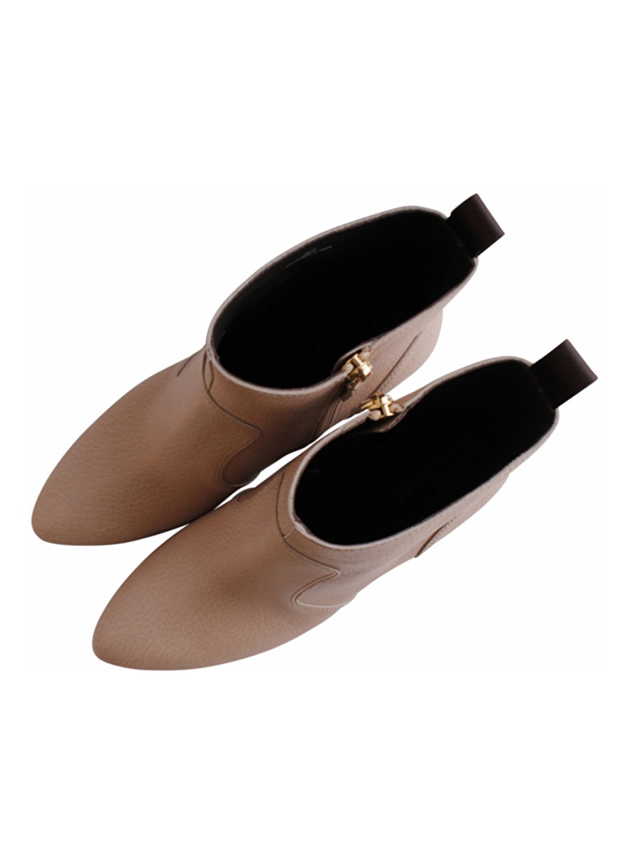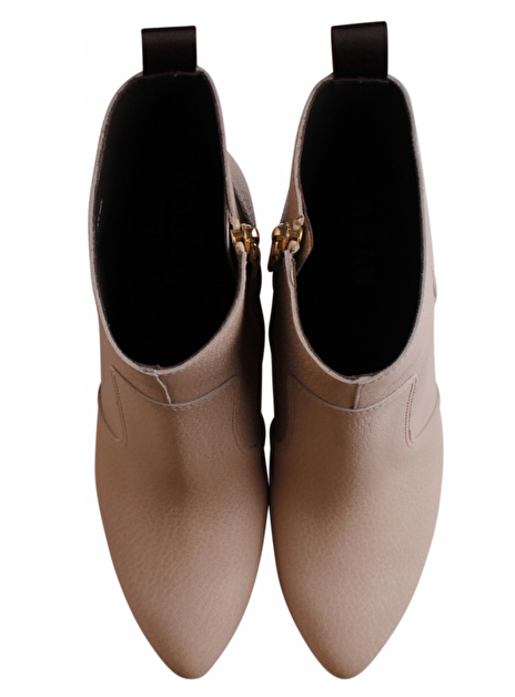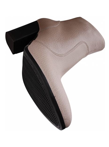 Nude beige enkellaars met rits en aantreklus. Ronde neus. Rubber schuine hak 8cm. Rubber zool.