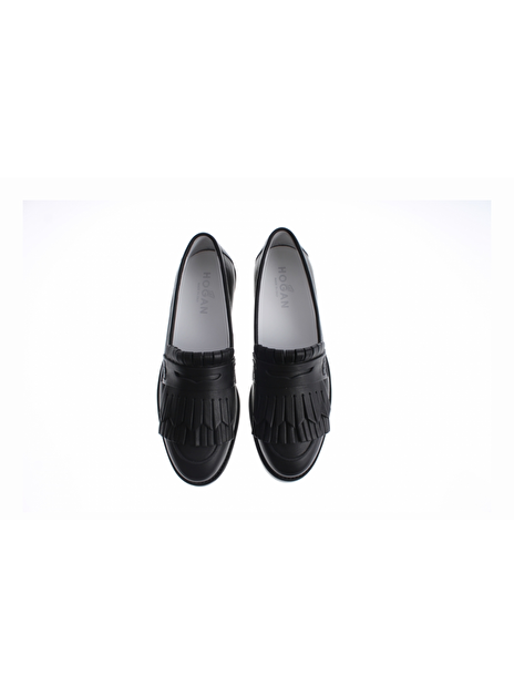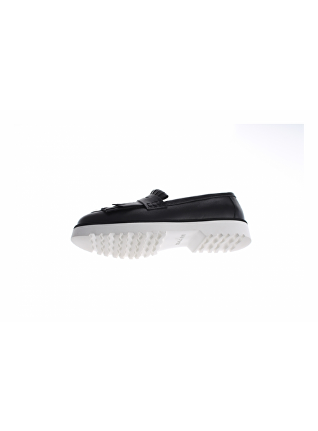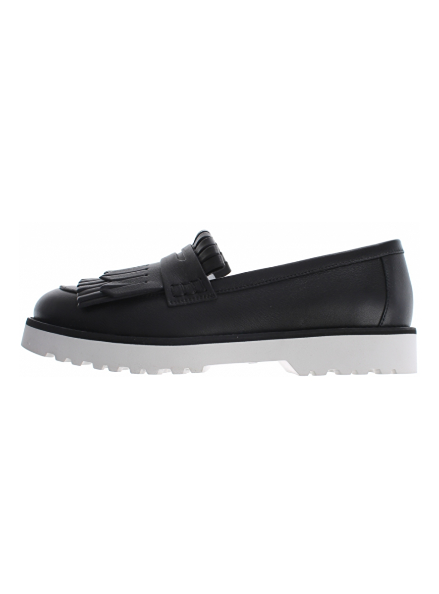 Mocassin zwart met grove witte zool en franjes op de neus. Deze waanzinnig leuke mocassin is zeer draagbaar en comfortabel. De mocassin heeft een slanke pasvorm en bestaat geheel uit leder op de rubberen zool na. De binnenzool is uitneembaar.