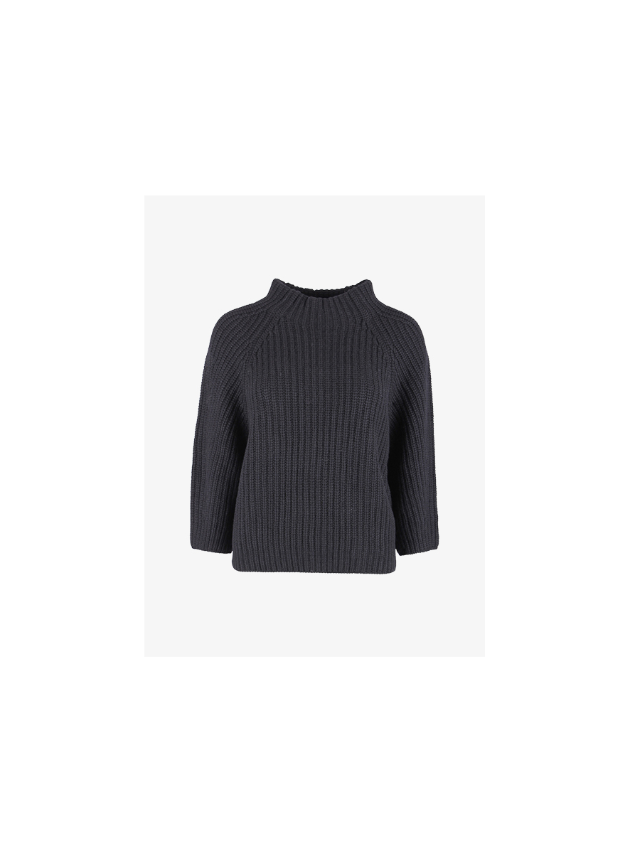 Ruimvallende pull met col. Stonewashed cashmere. 3/4 mouwen. 1/2 Patentsteek.
