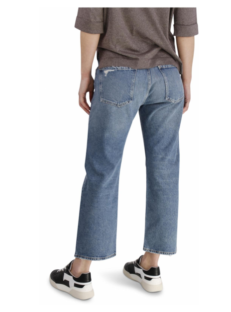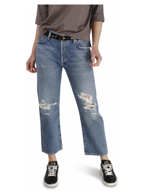 Boyfriend model met veel destroyed accenten rond de knie. wijd model.