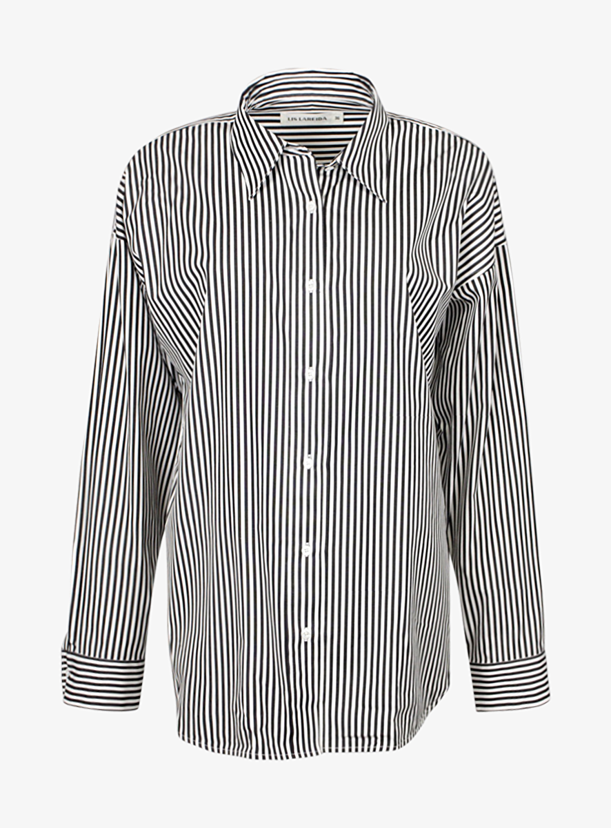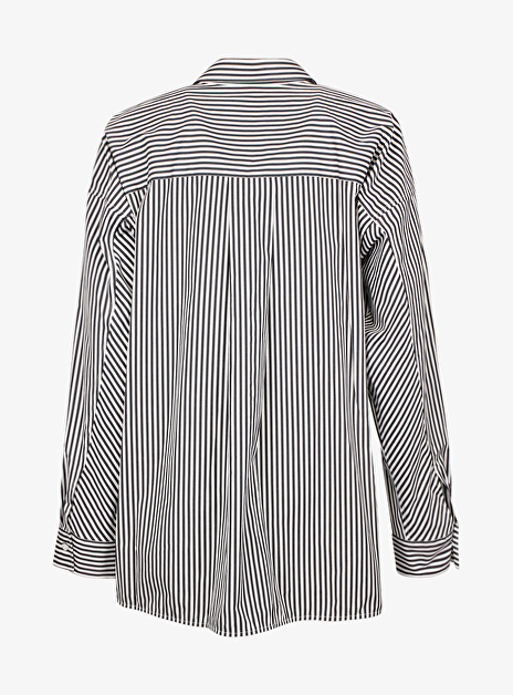 Detail: kraag - knoopsluiting - manchetten met knoopje - stolpplooi aan de achterkant - afgeronde zoom met witte bies aan de binnenkant - de voorkant valt 5 cm korter dan de achterkant.