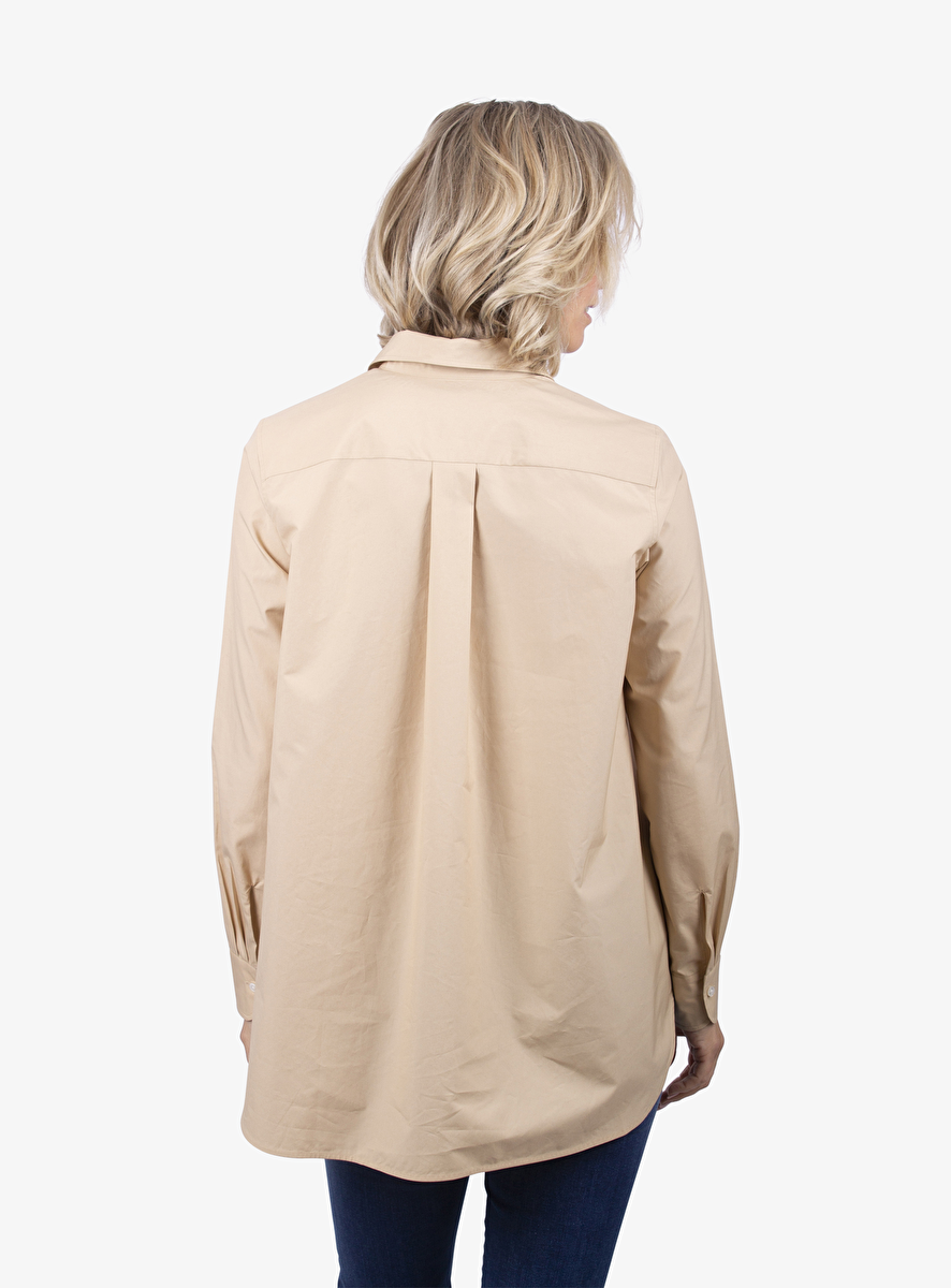 • Detail: blouse met kraag, brede borstzak en afgeronde zoom - manchetten met knoop - stolpplooi aan de achterkant.