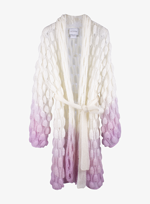 Detail: rechte halslijn - bubbels, gebreid - ballonmouwen - gebreide ceintuur.