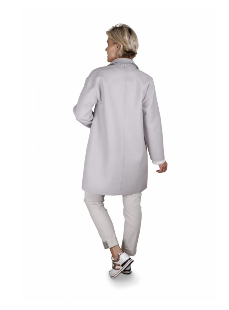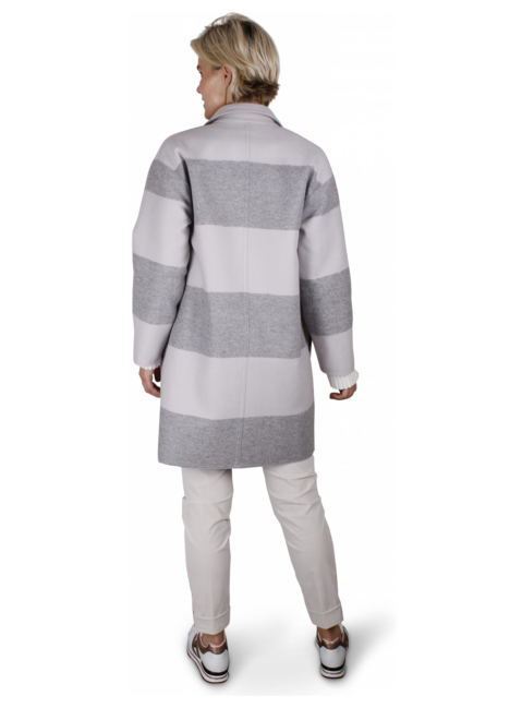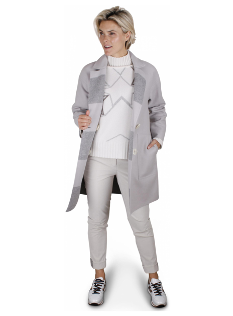 Wollen jas met rever en gebreide rand, vier knopen, grote zakken, grijs/kiezel gestreept en kiezel aan de andere kant, dus dubbelzijdig draagbaar.