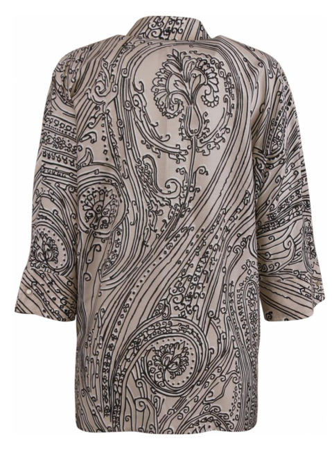 Nonchalante blouse in katoenmenging. Doorlopende 3/4 mouw (geen schoudernaad). De basis is kiezelbeige met wit en de kringel is in een donkere tint antraciet.