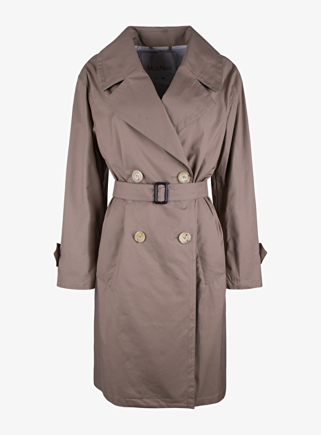 • Detail: kraag en revers - double breasted - steekzakken - stoffen ceintuur met bruine gesp - split aan de achterkant 40 cm.