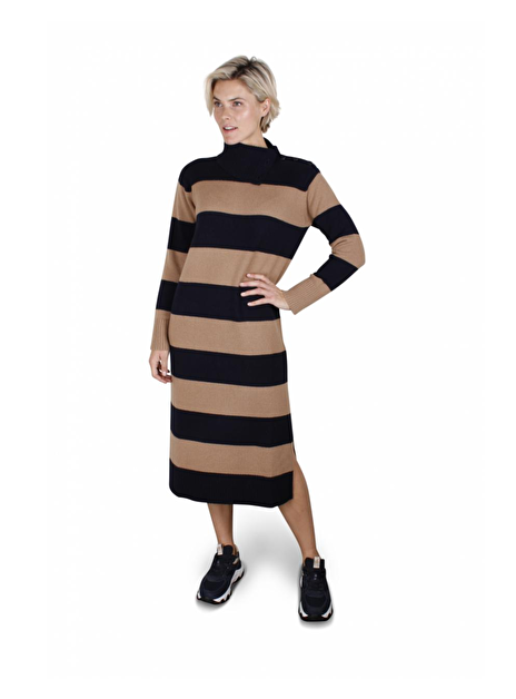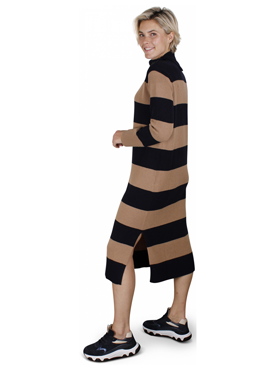 Lange jurk met variatie col. Deze kan open aan de zijkant met zes knopen op de hals en schouder. Split aan de zijkant 31cm.