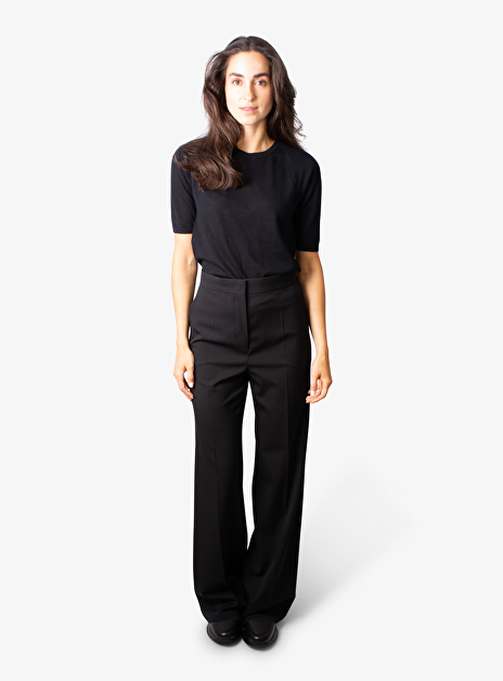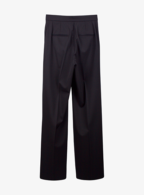 Detail: brede broekspijpen - steekzakken - persvouw - blinde paspelzakken aan de achterkant.