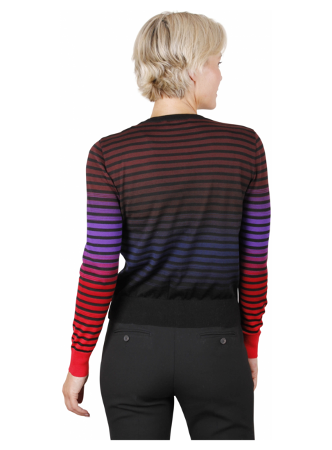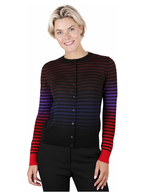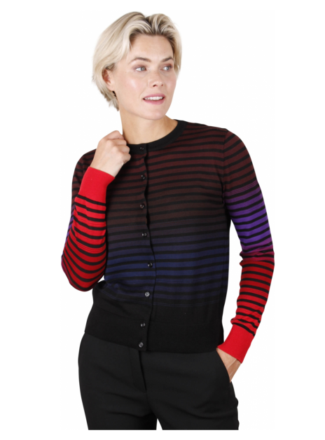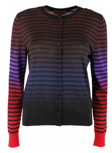 Vest met een ronde hals in gestreept motief rood, paars, zwart, blauw. Knoop sluiting.