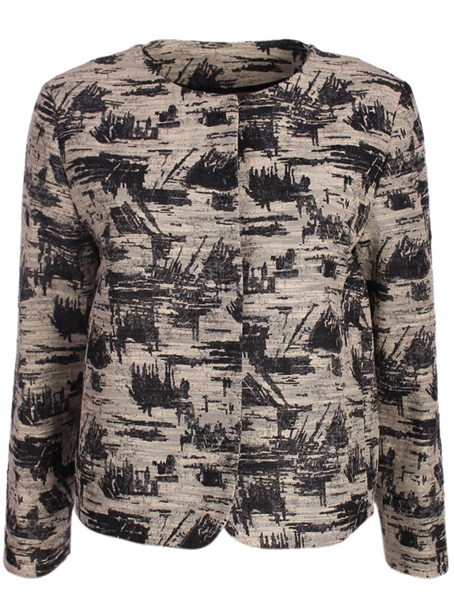 Jasje kort met blauw/wit ingeweven dessin. Door het ingeweven dessin zit een klein zilverdraadje waardoor de stof een beetje glanzend oogt. Het jasje heeft een ronde hals en lange mouw. Kan eventueel gesloten worden door drukkers. Aan de voorzijde twee steekzakjes. Het materiaal bestaat uit 67% katoen en 33% polyester.