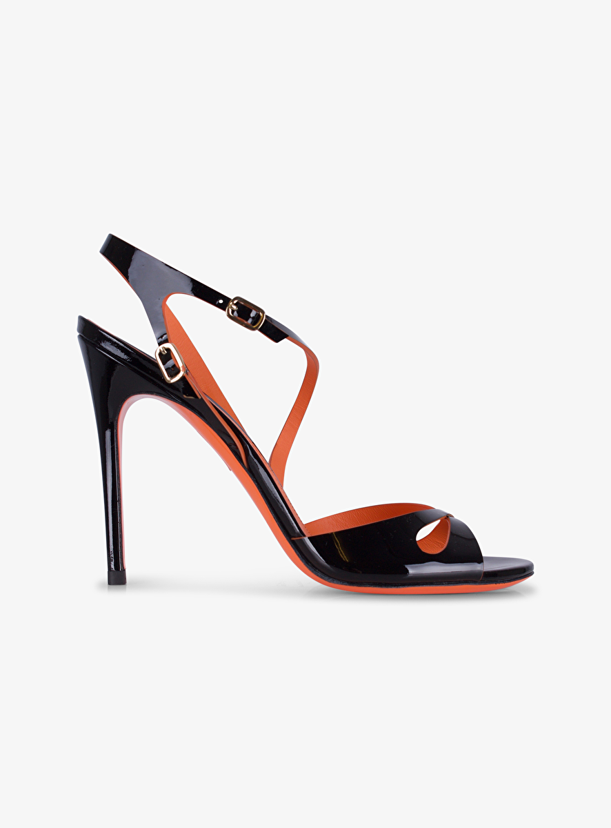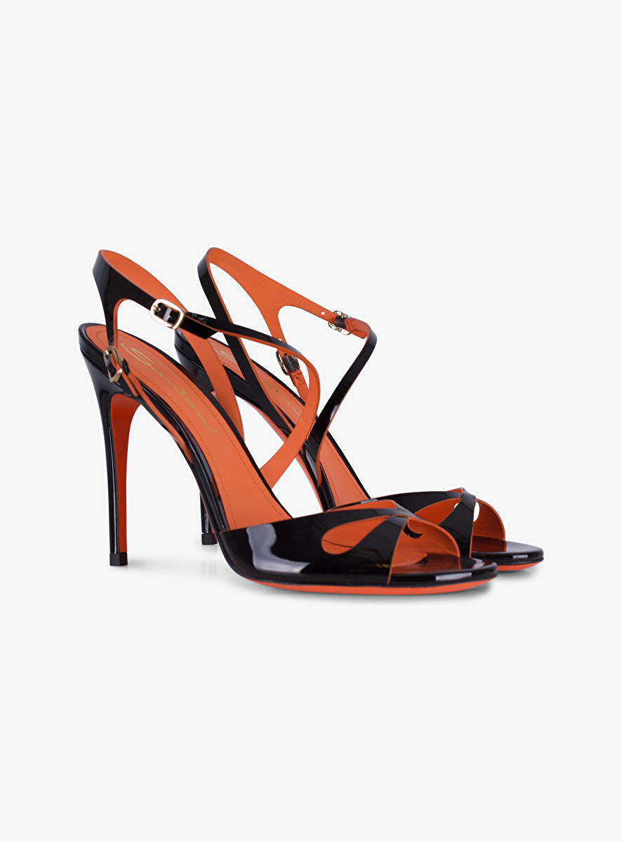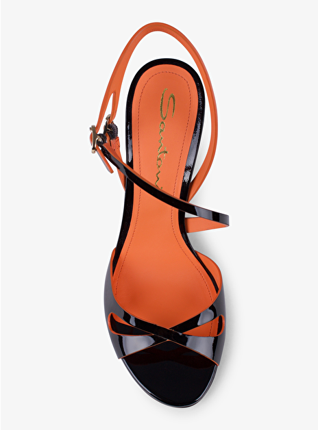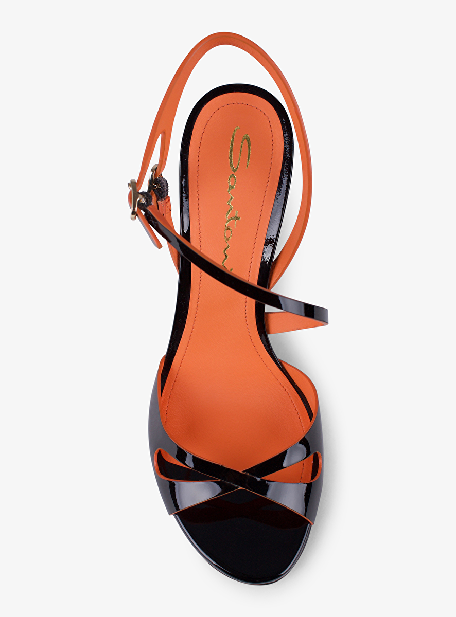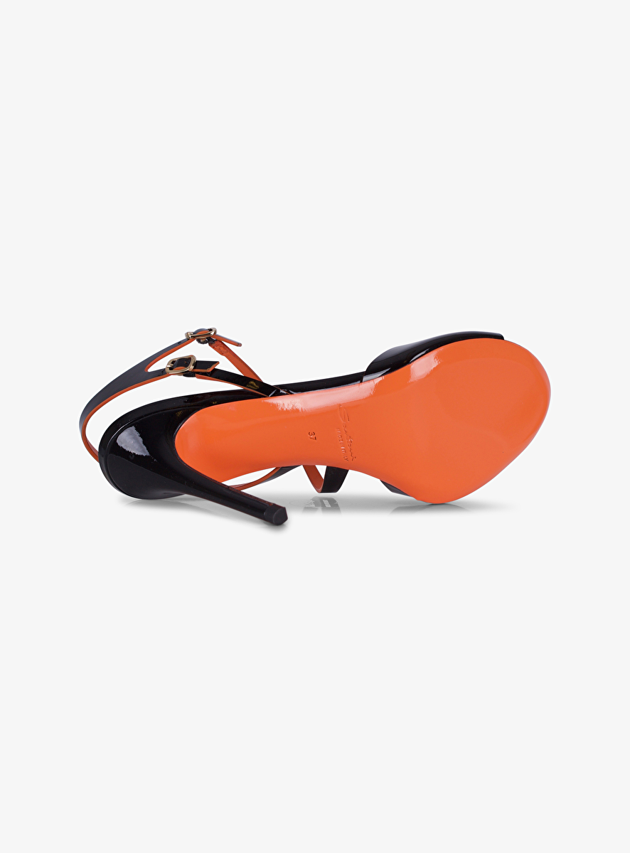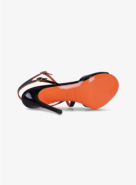 - Detail: pump met 'Santoni' fel oranje binnenzool en gelakte oranje leder onderkant van de pump.