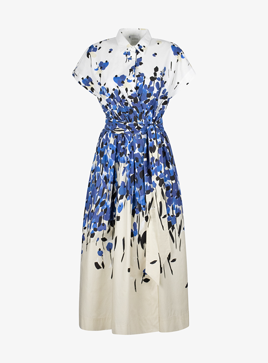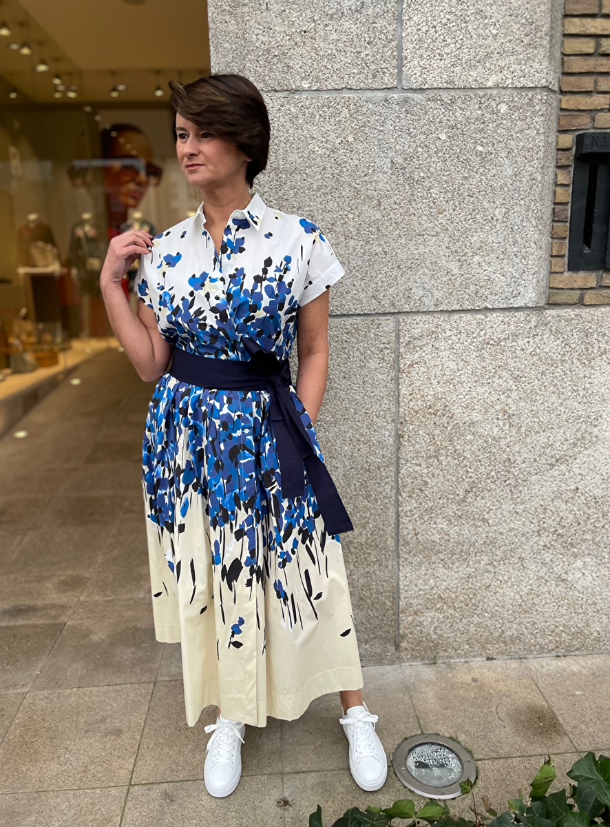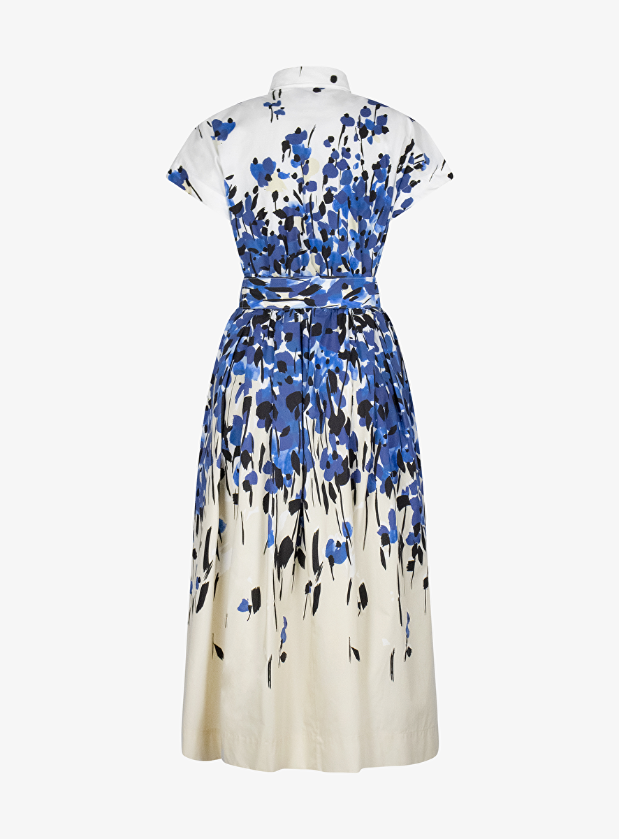 jurk kapmouw wit met blauw beige dessin wijde rok