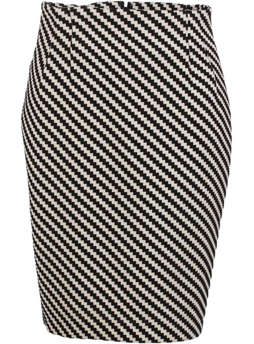 Rok uitgevoerd in zwart/wit met grafische print. Betreft een recht model rok met een blinde" ritssluiting aan de achterzijde. Materiaal bestaat uit 56% katoen en 32% polyester 10% viscose en 2% elastan. De voering van de rok bestaat uit cupro 85% en elastan 15%.