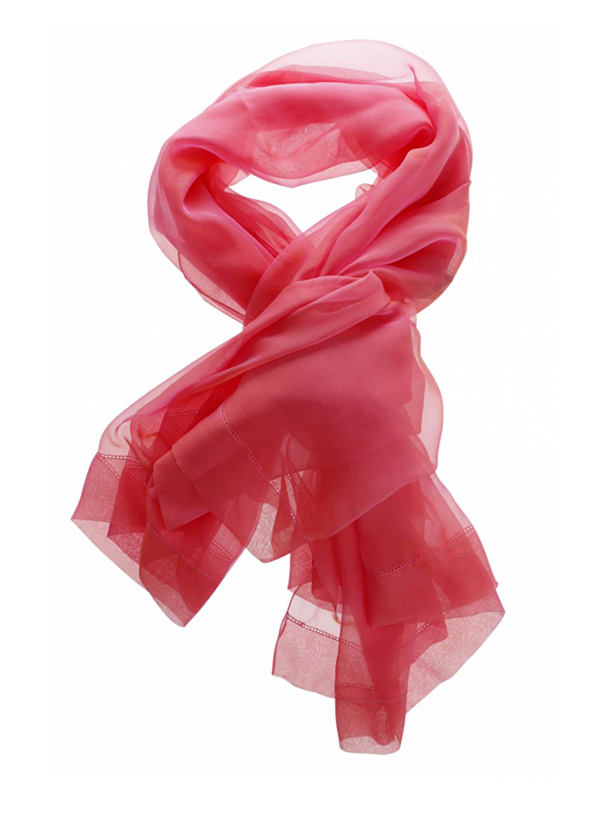 Deze 100% zijde shawl is twee kleurig, roze en oranje als het licht er op valt. Mooi als stola of fijne omslag te dragen.