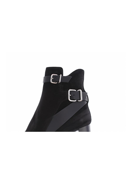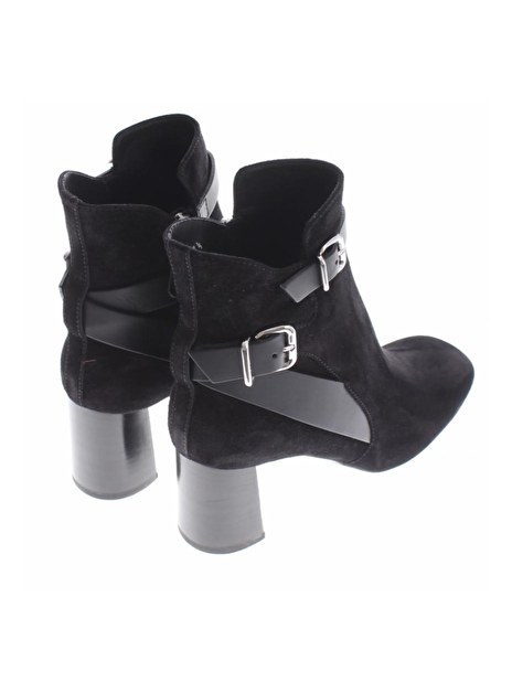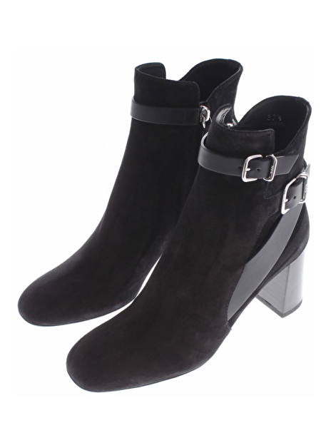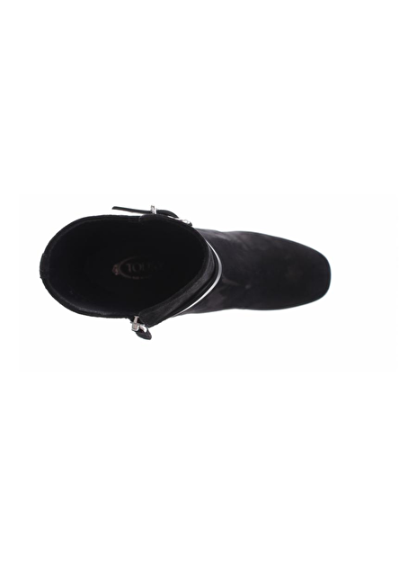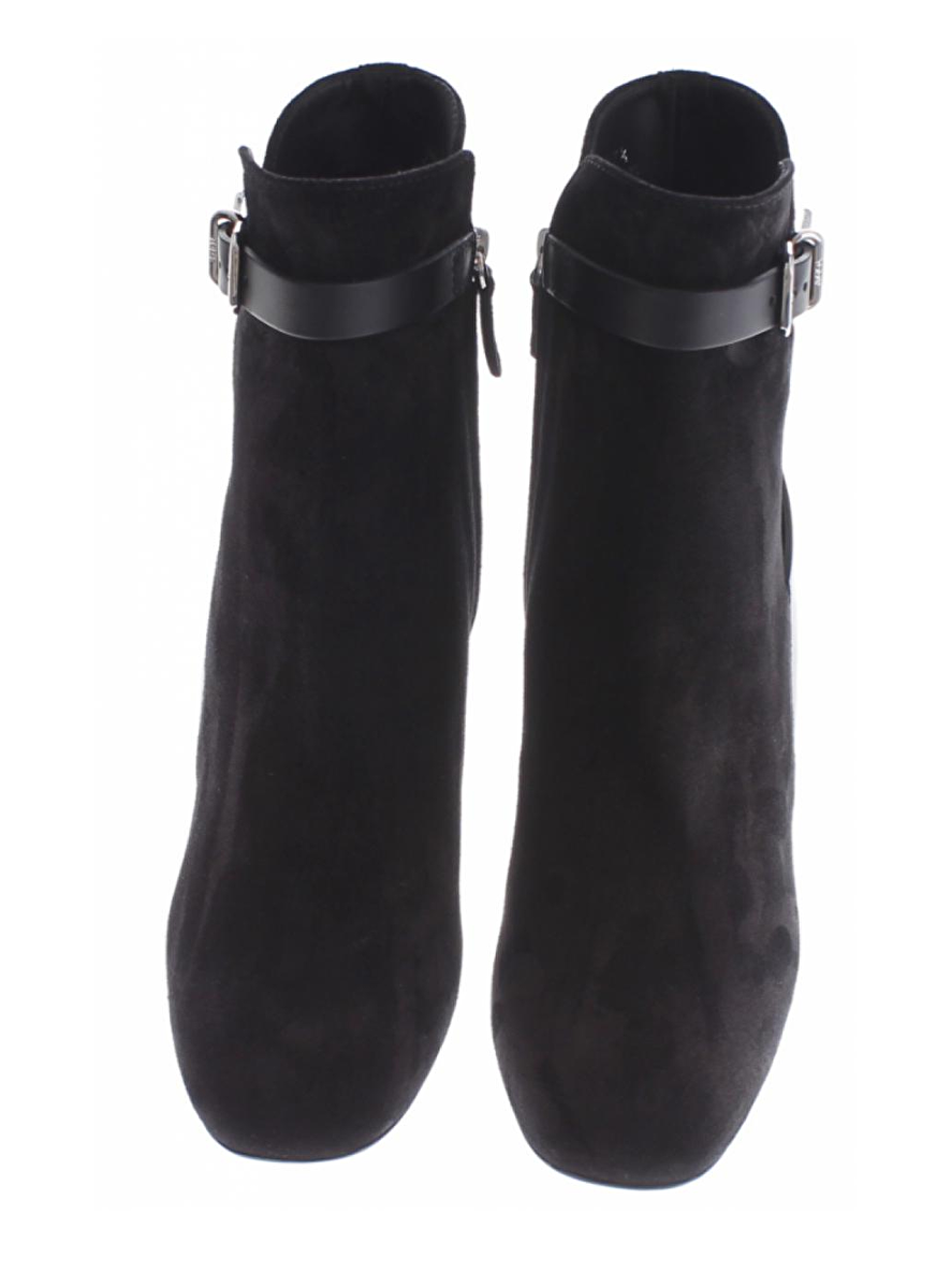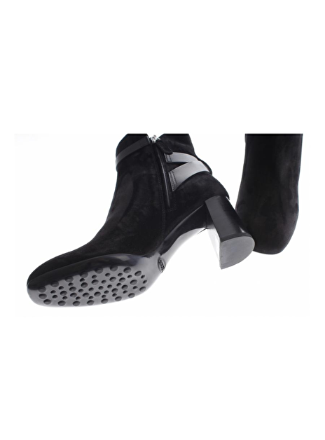Deze suede zwarte laars is slank gesneden, heeft een hak van 7cm die naar onder toe iets uit loopt. De riempjes zijn van leder en de neus van het laarsje is ietwat vierkant. De laarsjes hebben een rits aan de binnenkant.