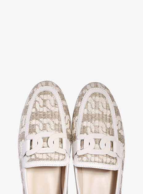 Detail: geweven dessin met logo - kunstof logo gesp.