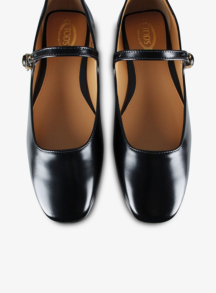 Detail: Mary Jane stijl ballerina - Tod's monogram knoop - afgeronde neus - verstelbaar bandje op wreef.