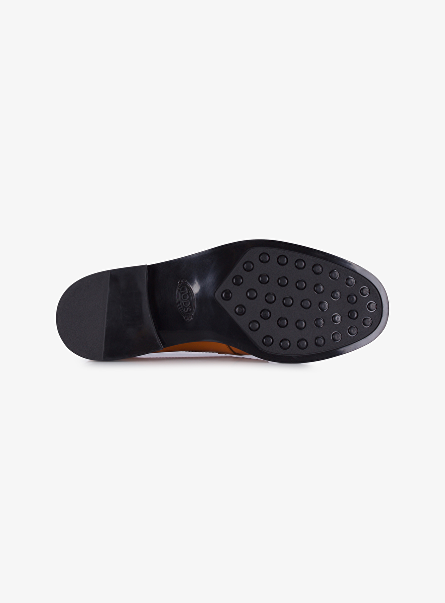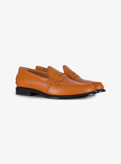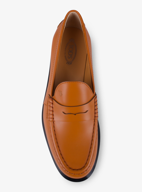 Prachtig vormgegeven mocassin in warm oranje met een contrast zool in zwart. Een echte klassieker.